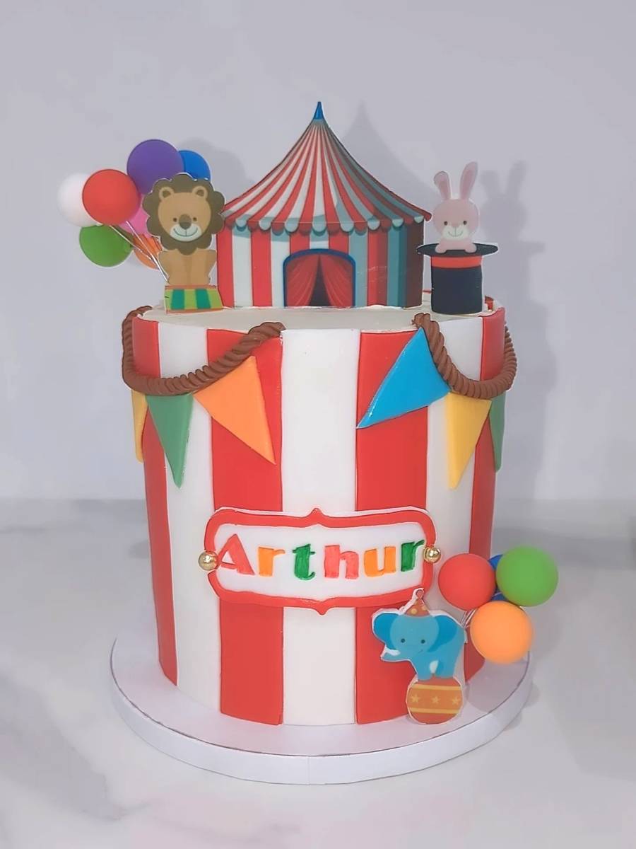 Le gâteau s’articule autour d’un design rouge et blanc, avec des animaux de cirque créer sur feuille de sucre viennent dynamiser l’ensemble, associés à des toppers en forme de ballons pour renforcer l’ambiance joyeuse souhaitée par la famille.