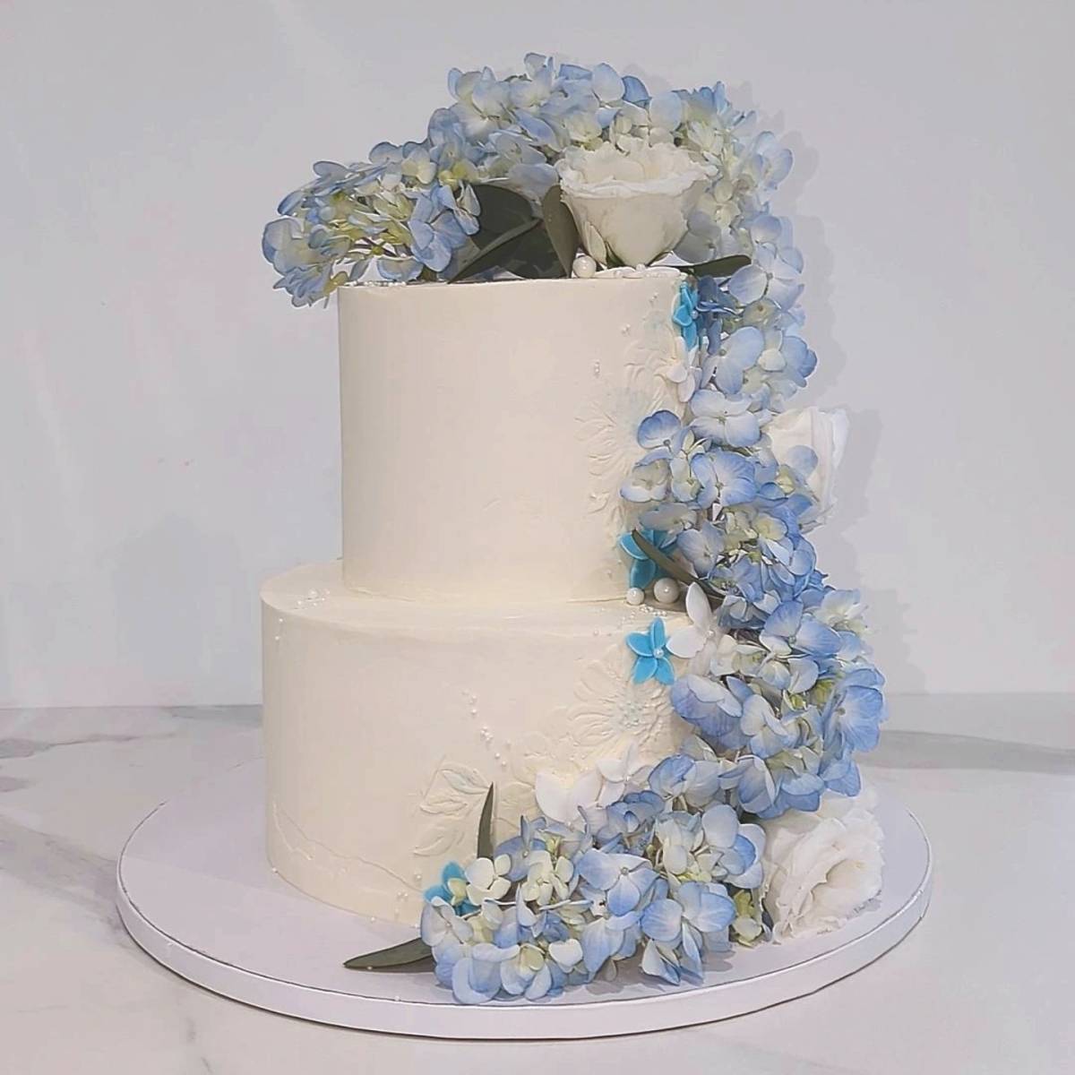 Nous avons imaginé pour cette occasion un décor délicat avec une touche personnelle de bleus pastels, apportée par des branches d'hortensia en cascade. Un léger pochage floral à la crème ajoute une finition élégante, pour accentuer l'effet couture de cette pièce unique.