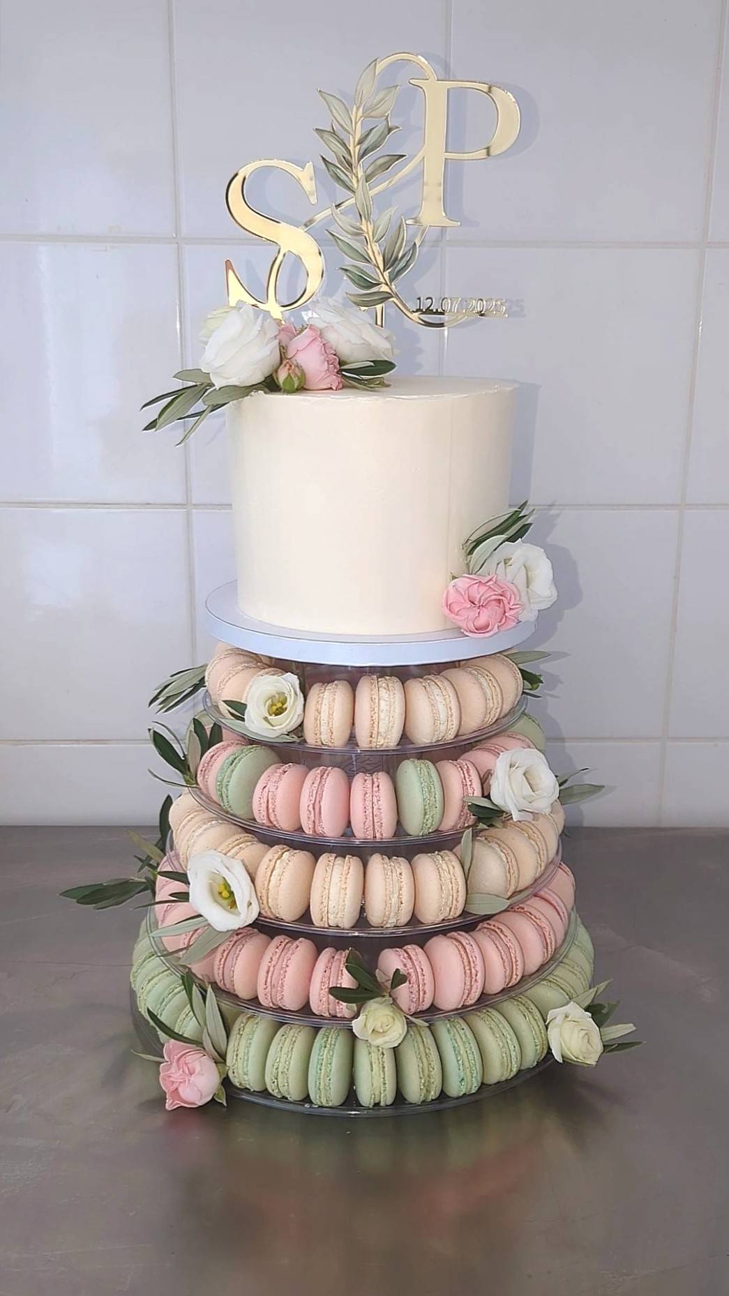 L’ensemble est sublimé par des fleurs fraîches soigneusement sélectionnées et un topper majestueux portant les initiales des mariés. Chaque détail de cette création a été pensé pour marquer les esprits et créer une atmosphère visuelle et gustative inoubliable.