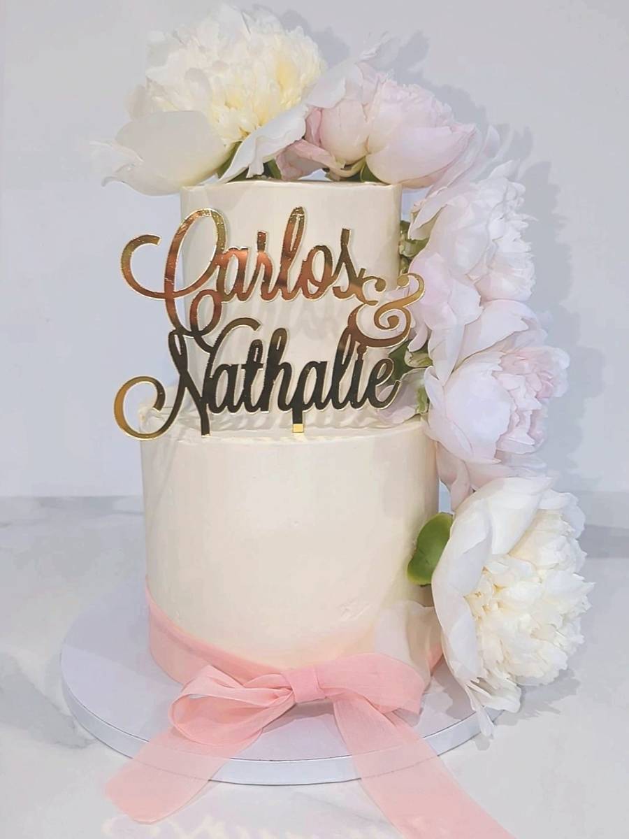 Un ruban en mousseline rose est venu sublimer la base du gâteau, apportant une touche de douceur et de légèreté. Un topper personnalisé avec les prénoms des mariés a été ajouté en finition pour une touche unique et intemporelle.